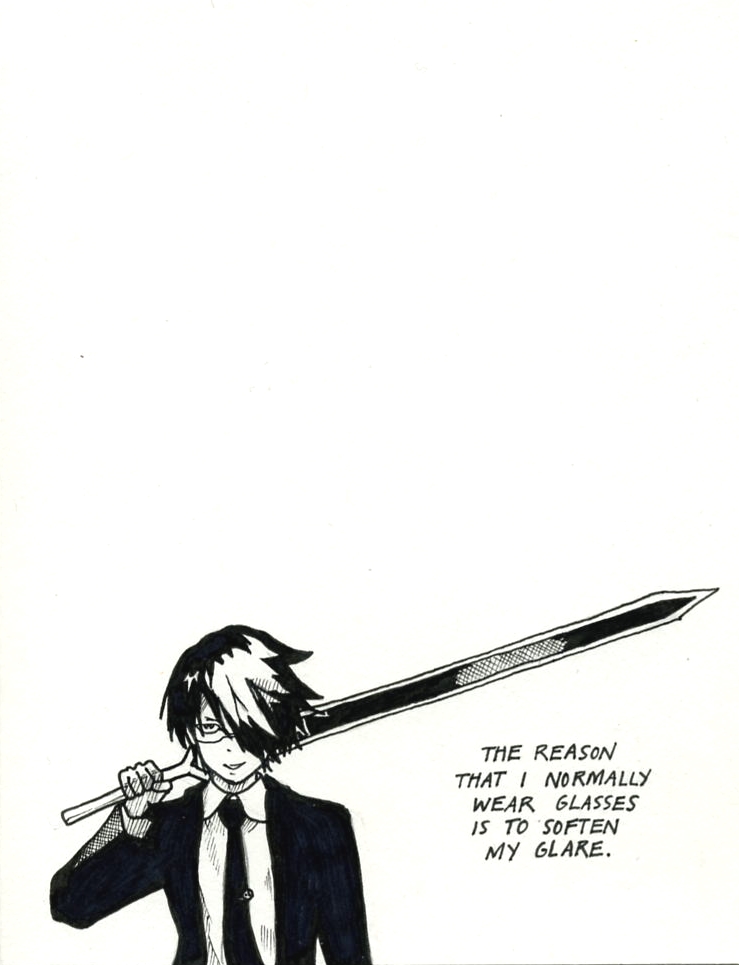 The heart she’s holding says ‘I love you!’ in Japanese (I hope). And who wouldn’t want a sword thing like that?!Ha! He doesn’t usually have a glare, or a sword. He does have glasses…and a sweet suit.